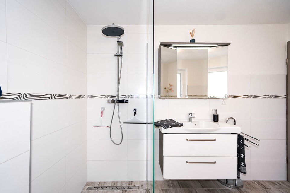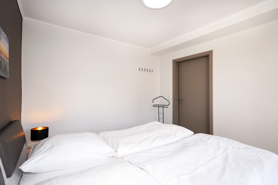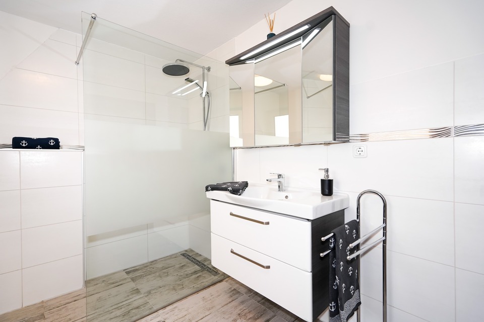 Das große Schlafzimmer stellt ein Doppelbett (2x90x200) zur Verfügung. Das Kinderschlafzimmer verfügt über ein Etagenbett und einen Kleiderschrank. Zwei Stufen führen in das Kinderzimmer. Die Ausstattung im Bad lässt keine Wünsche übrig: das Tageslichtbad bietet Ihnen eine Walk-in-Dusche, einen Waschtisch und ein WC.