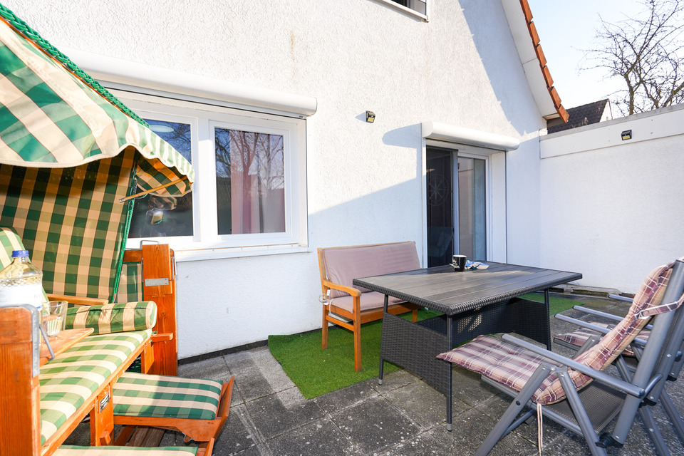 Ein weiteres Highlight des Hauses ist der wunderschöne Garten mit einer eigenen Terrasse und einem süßen Gartenhaus – der perfekte Ort, um die Sonnenstrahlen zu genießen oder am Abend zu grillen. Relaxen Sie in unserem gemütlichen Strandkorb. Durch das kleine Gartentor gelangen Sie zum Parkplatz und zur Fahrradgarage. Sie können Ihre E-Bikes hier auch aufladen.